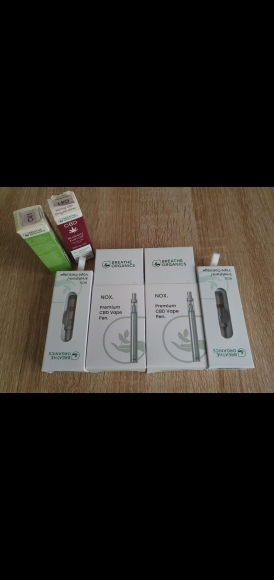 Hallo ich verkaufe hier 2 Vapes von Breathe organics original verpackt mit 2 Aufsätzen und 2 Liquids geöffnet.