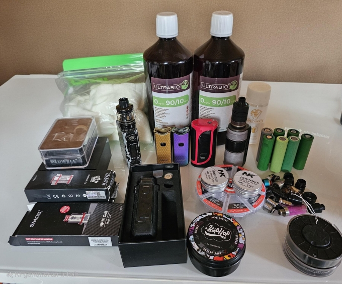 Dabei sind z.B. zwei Liter Base, das IPX80 Kit. Crown set, 2x Nord Kit, Ikonn220, Akkus, 1x Aroma von Checkmate, iStick Power mono (so gut wie neu), Drähte coils Watte usw.. einiges sollte gereinigt werden.